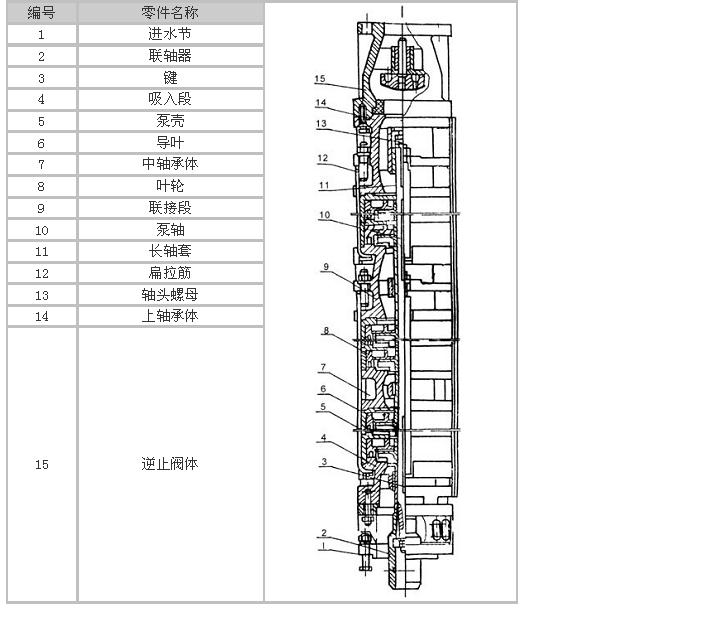 1. 動(dòng)水位低于泵吸入口。 2. 輸水管漏水嚴(yán)重或水管脫開(kāi)。 3. 轉(zhuǎn)子和軸松動(dòng)。 4. 部分葉輪松動(dòng)。 5. 電機(jī)反轉(zhuǎn)。 6. 管路堵塞。 |